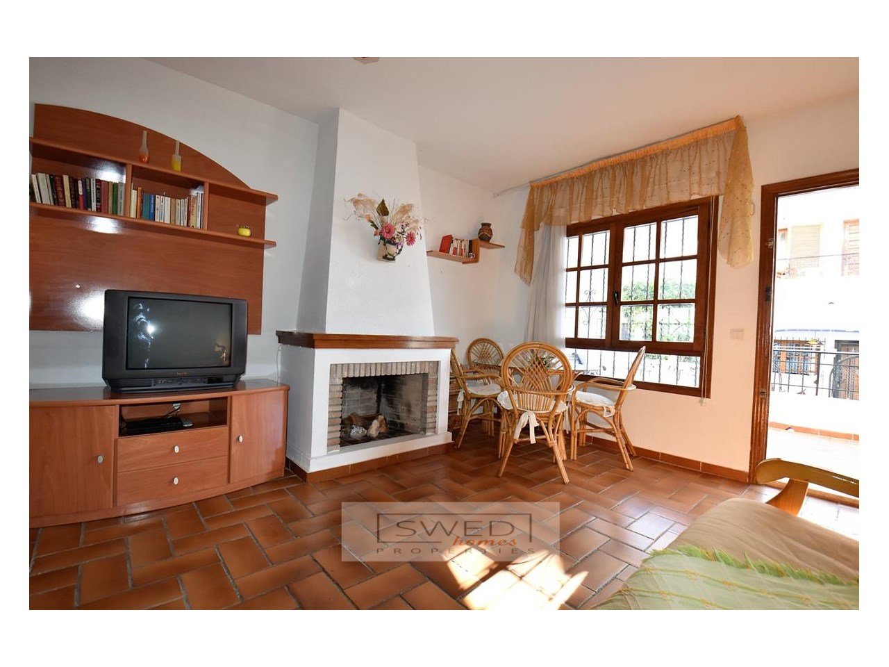 Bungalow på bottenvåningen med 2 sovrum, badrum, vardagsrum med öppen spis, öppet kök, uteplats / galleri, mycket solig terrass och en trevlig hörnträdgård.