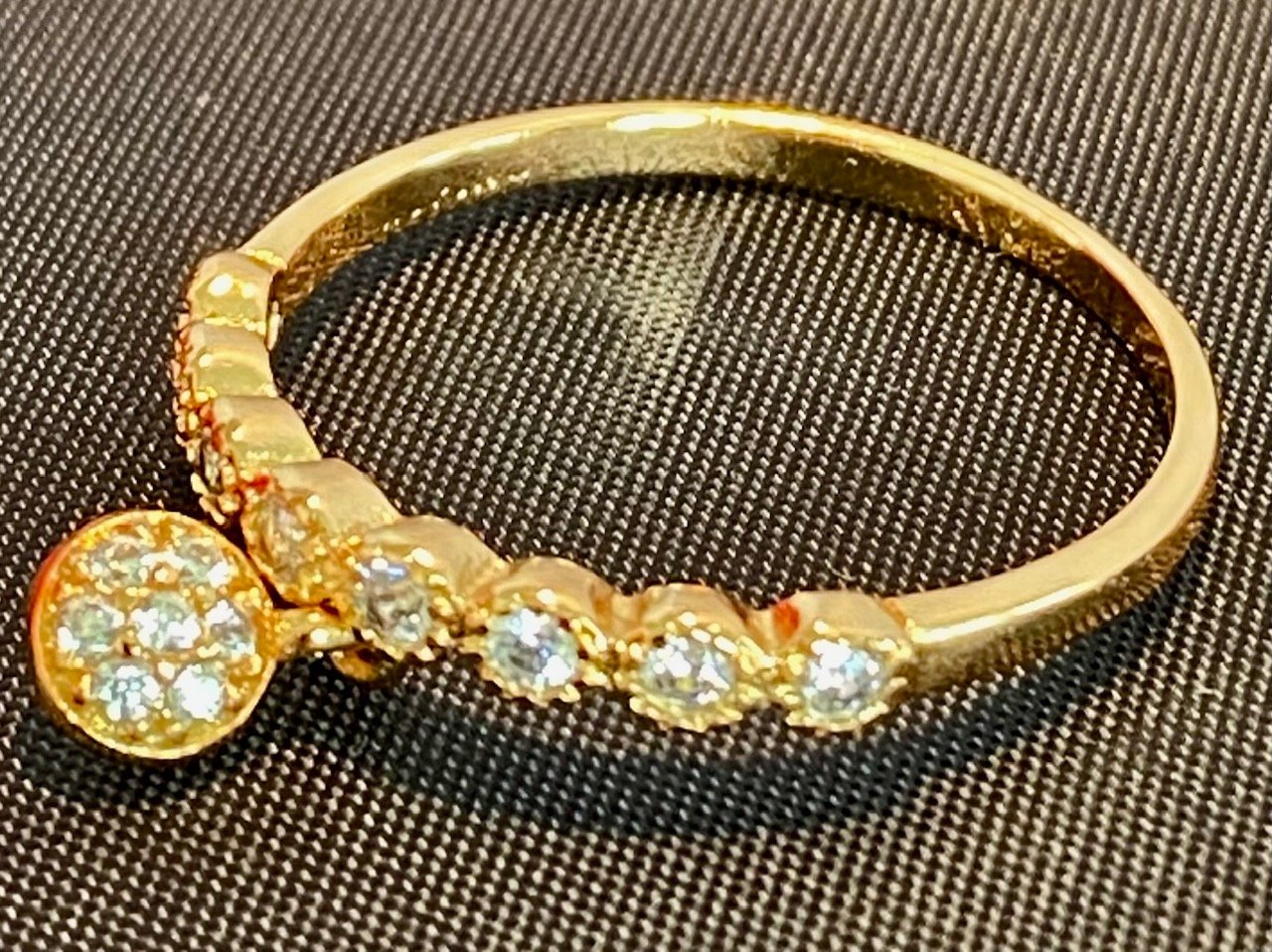 Söt smal ring i guldpläterad färg med stenar och en hängande liten berlock